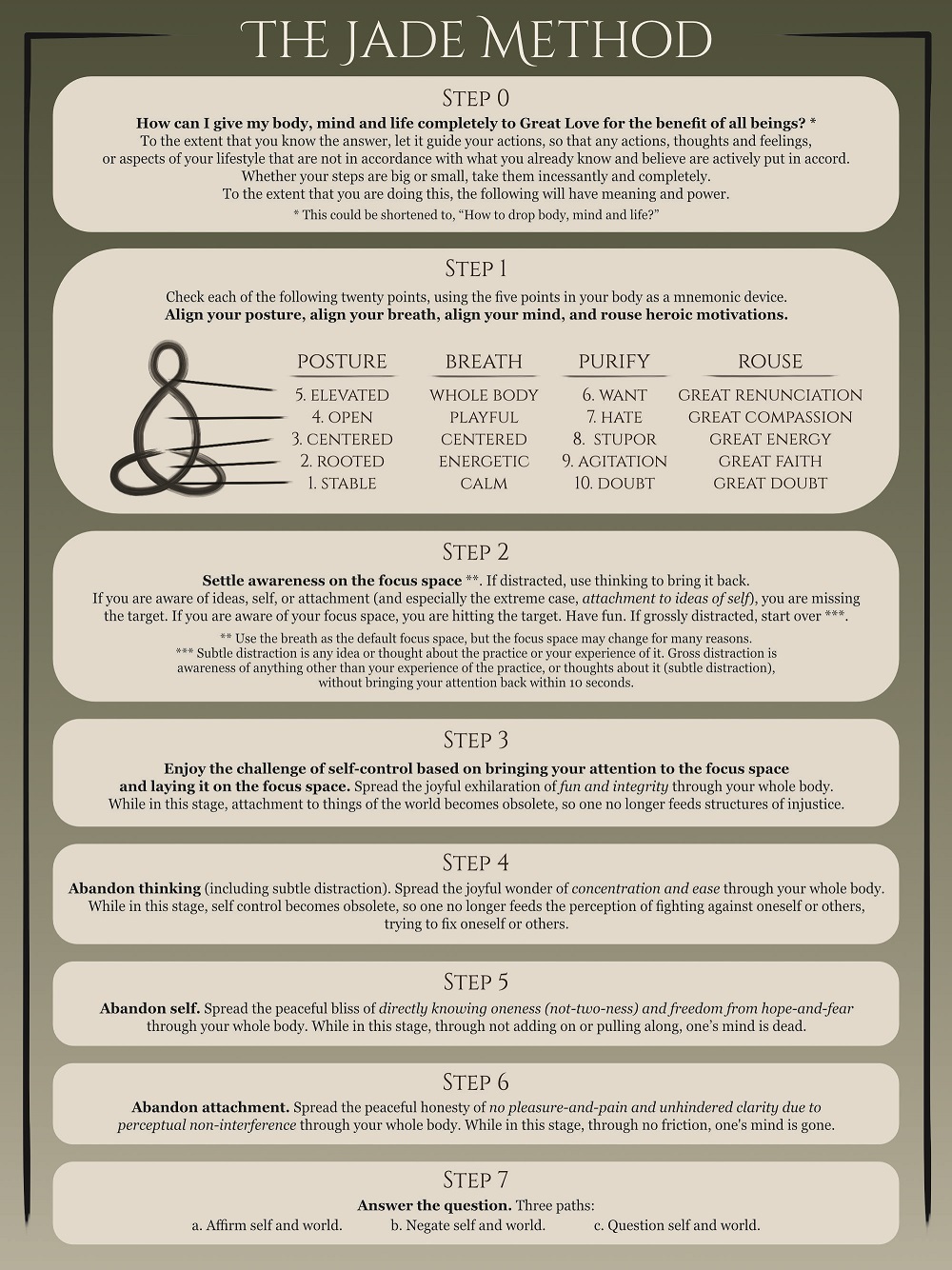 The Jade Method provides a balanced and accessible approach to aligning body and mind in meditation. It highlights the importance of aligning the posture, noting the presence of mental hindrances, cultivating the breath, and rousing great intentions.
